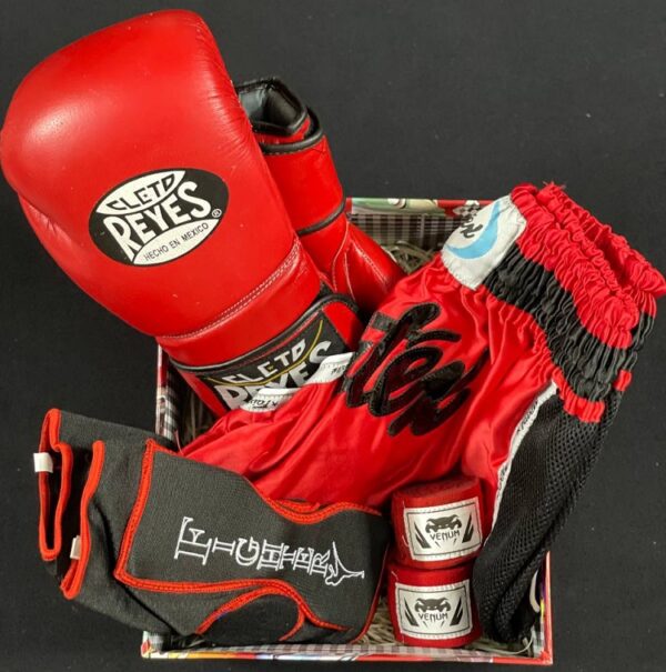 این پک ورزشی شامل : یک جفت دستکش چزم ریس قرمز، شورت رزمی فرتکس قرمز، قوزک بند فایتر و باند بوکس 5 متری قرمز است.